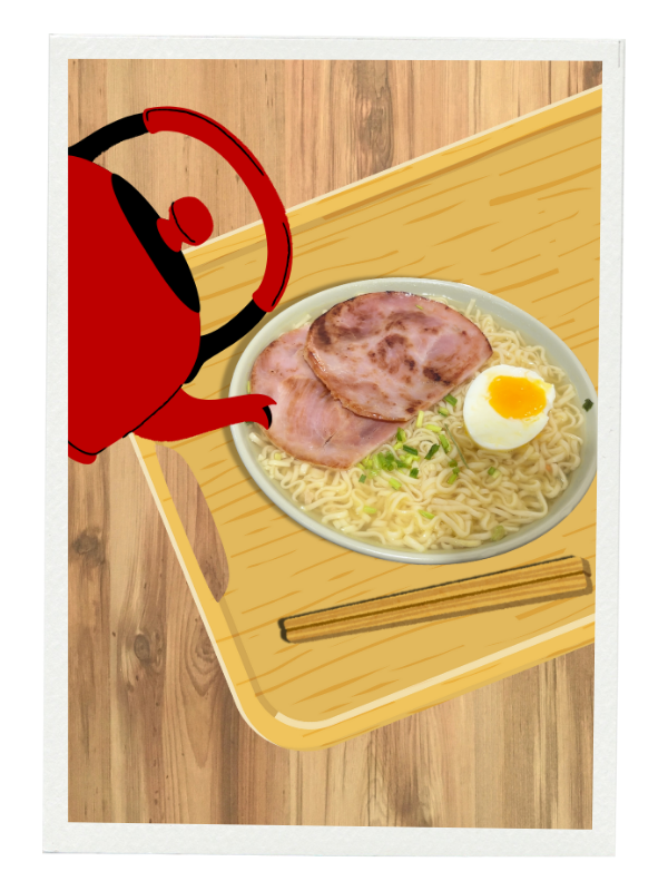 Instant ramen topped with ham & Boiled egg